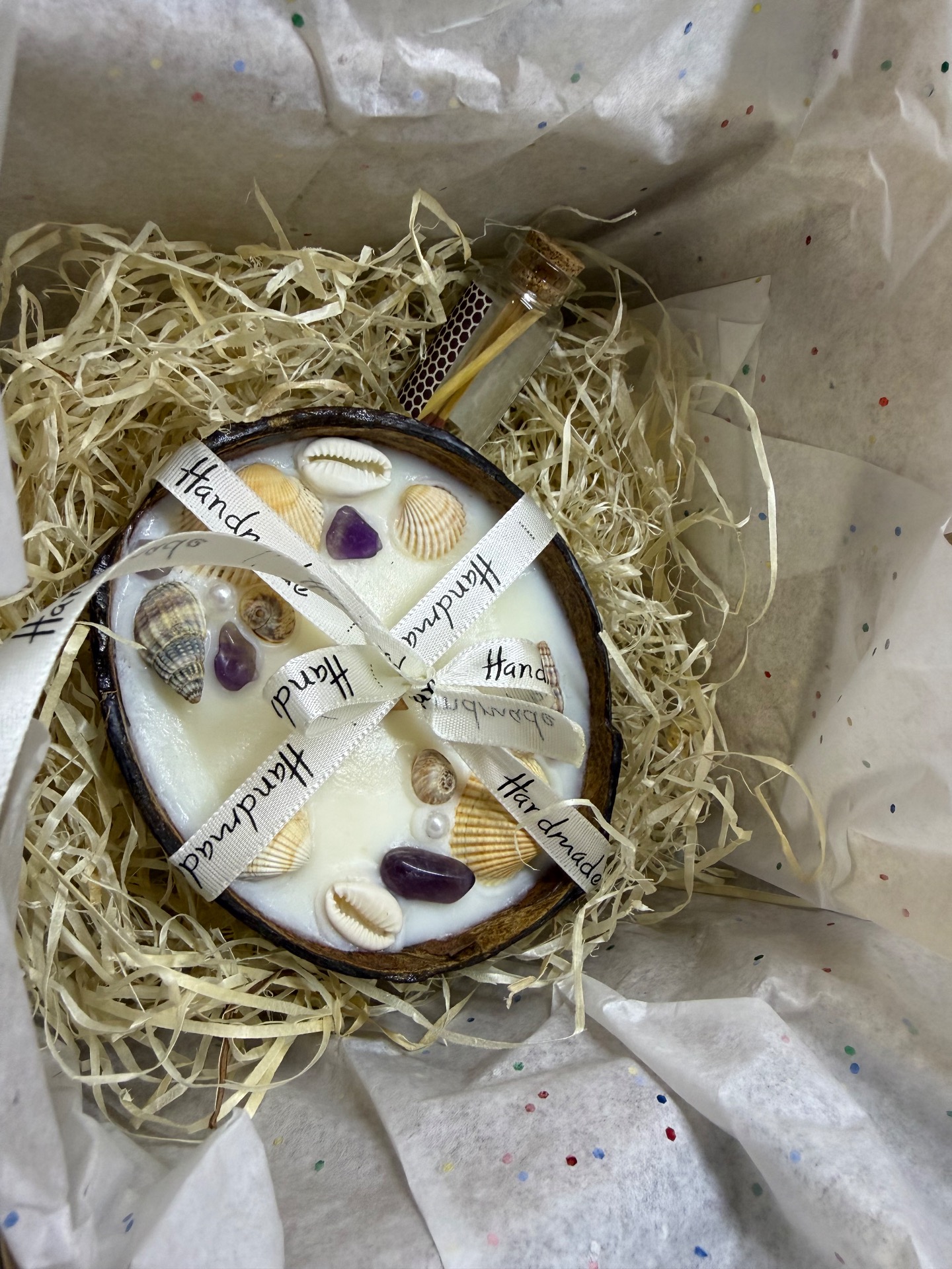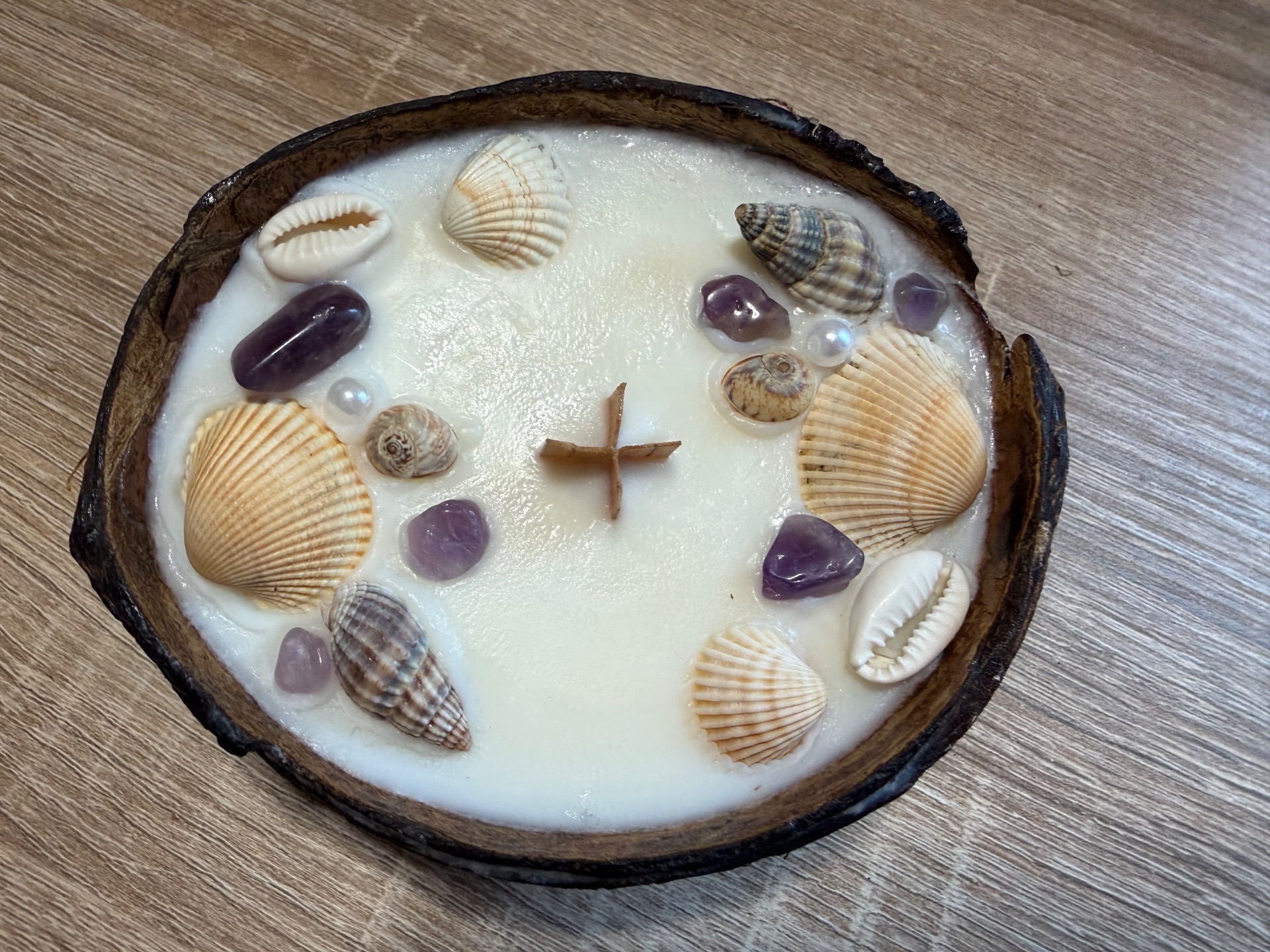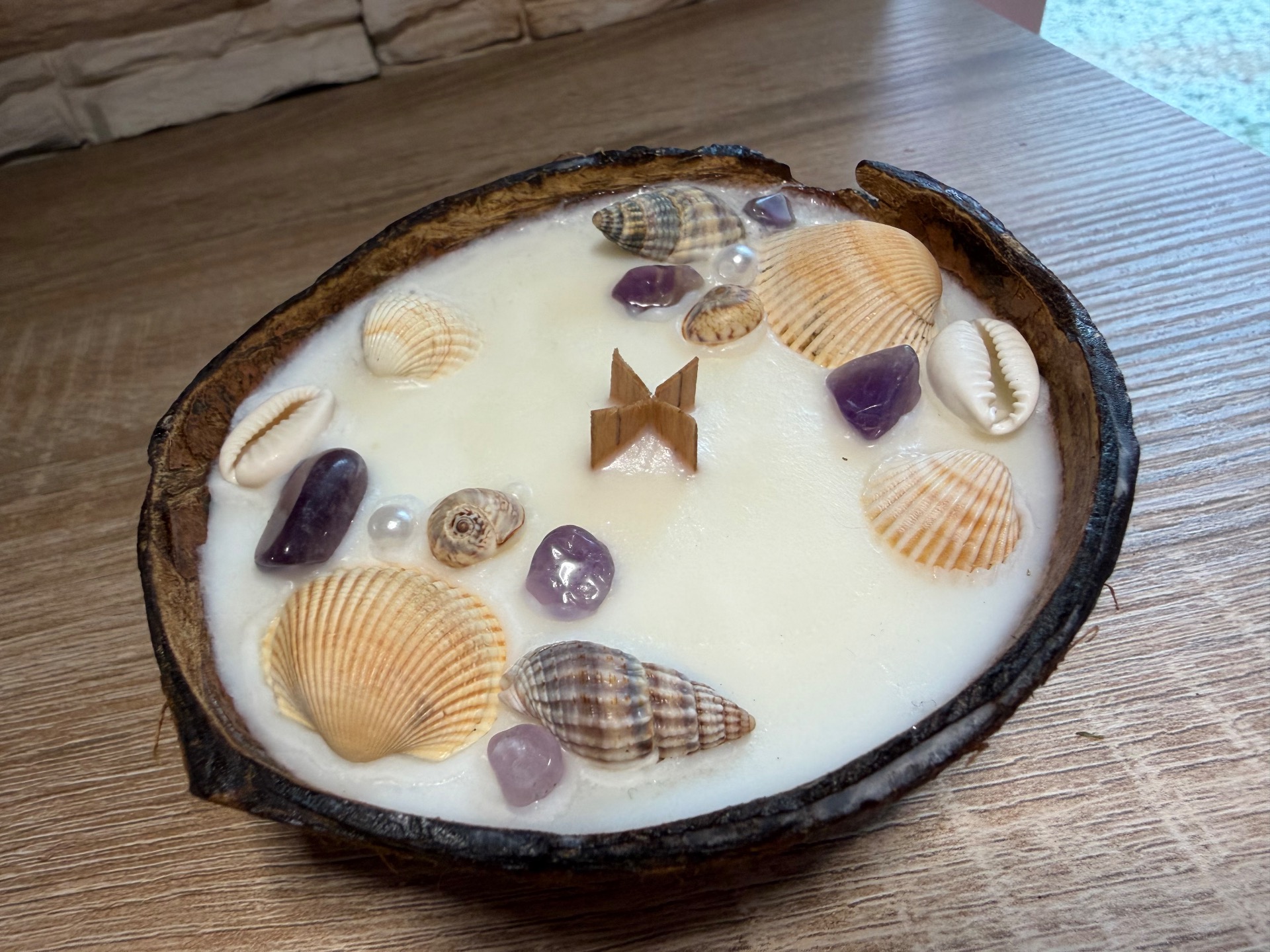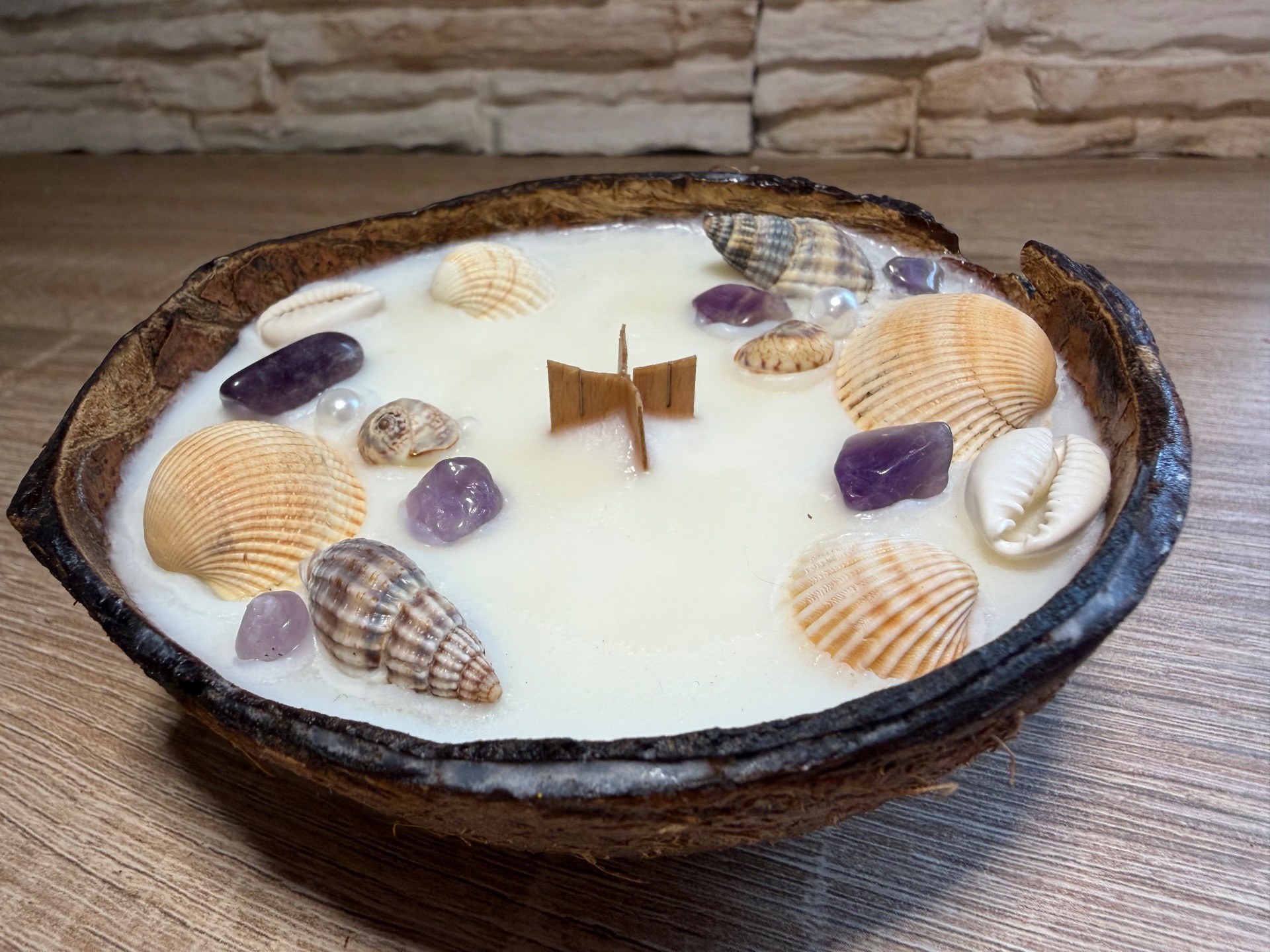 - Ruční výroba + originální přírodní dekorace, dřevěný knot + pravé mořské mušle + minerál ametyst