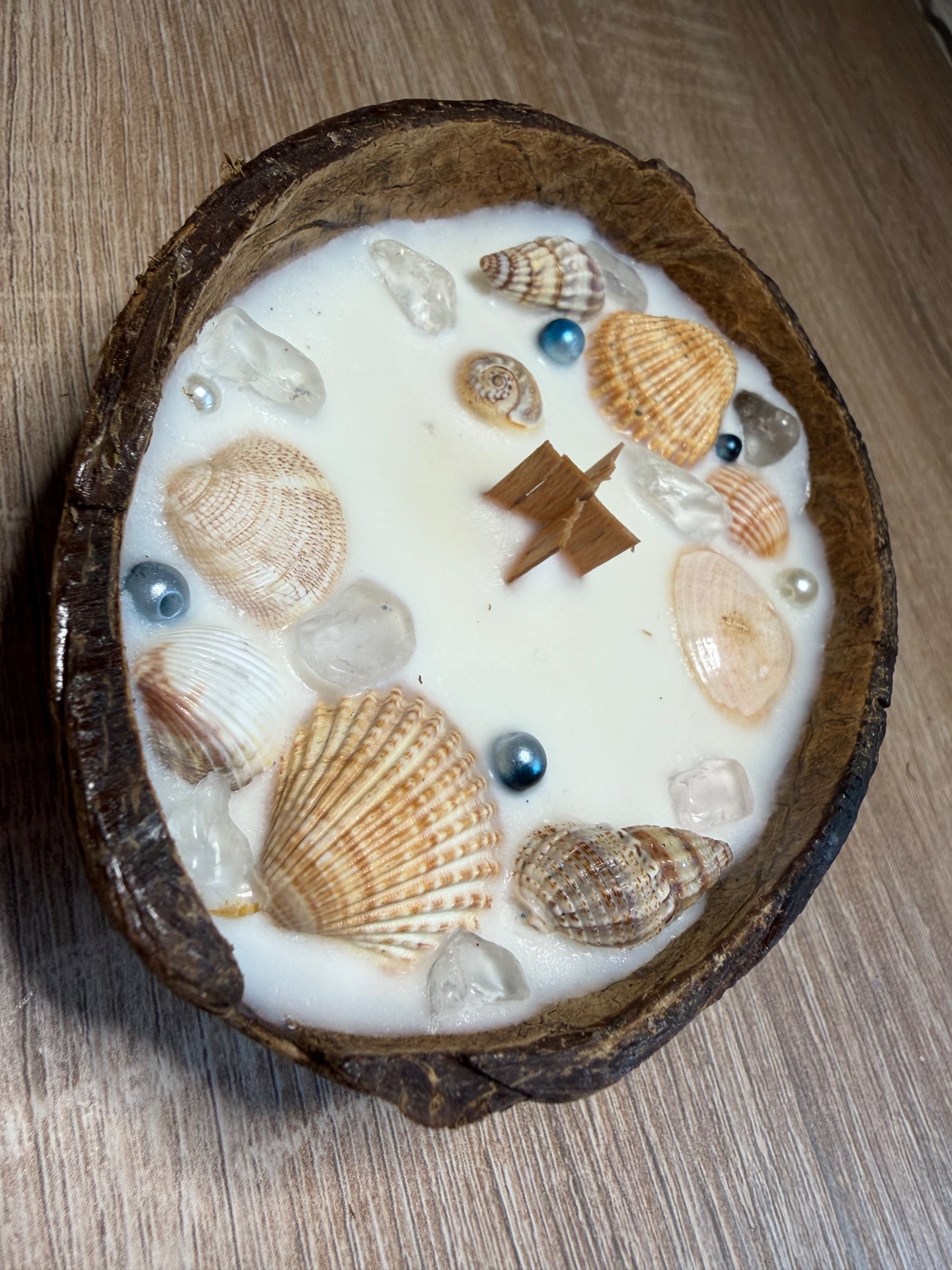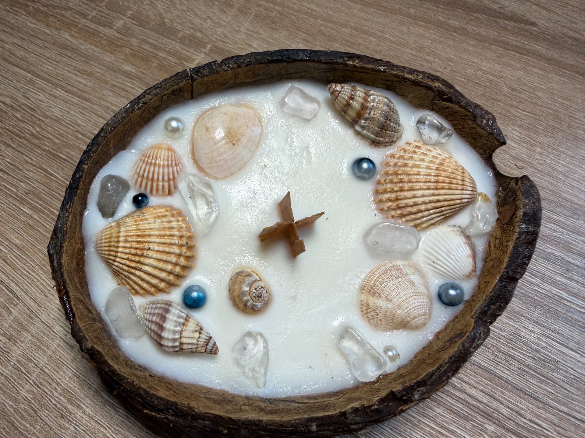 - Ruční výroba + originální přírodní dekorace, dřevěný knot + ( pravé mořské mušle a minerál kříšťál)