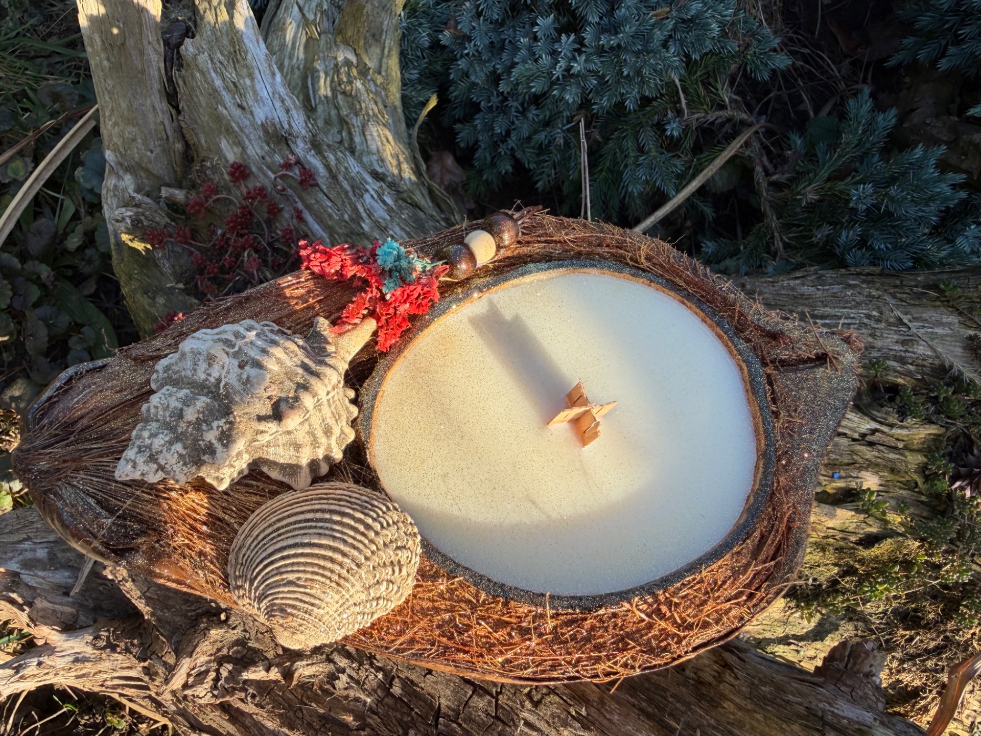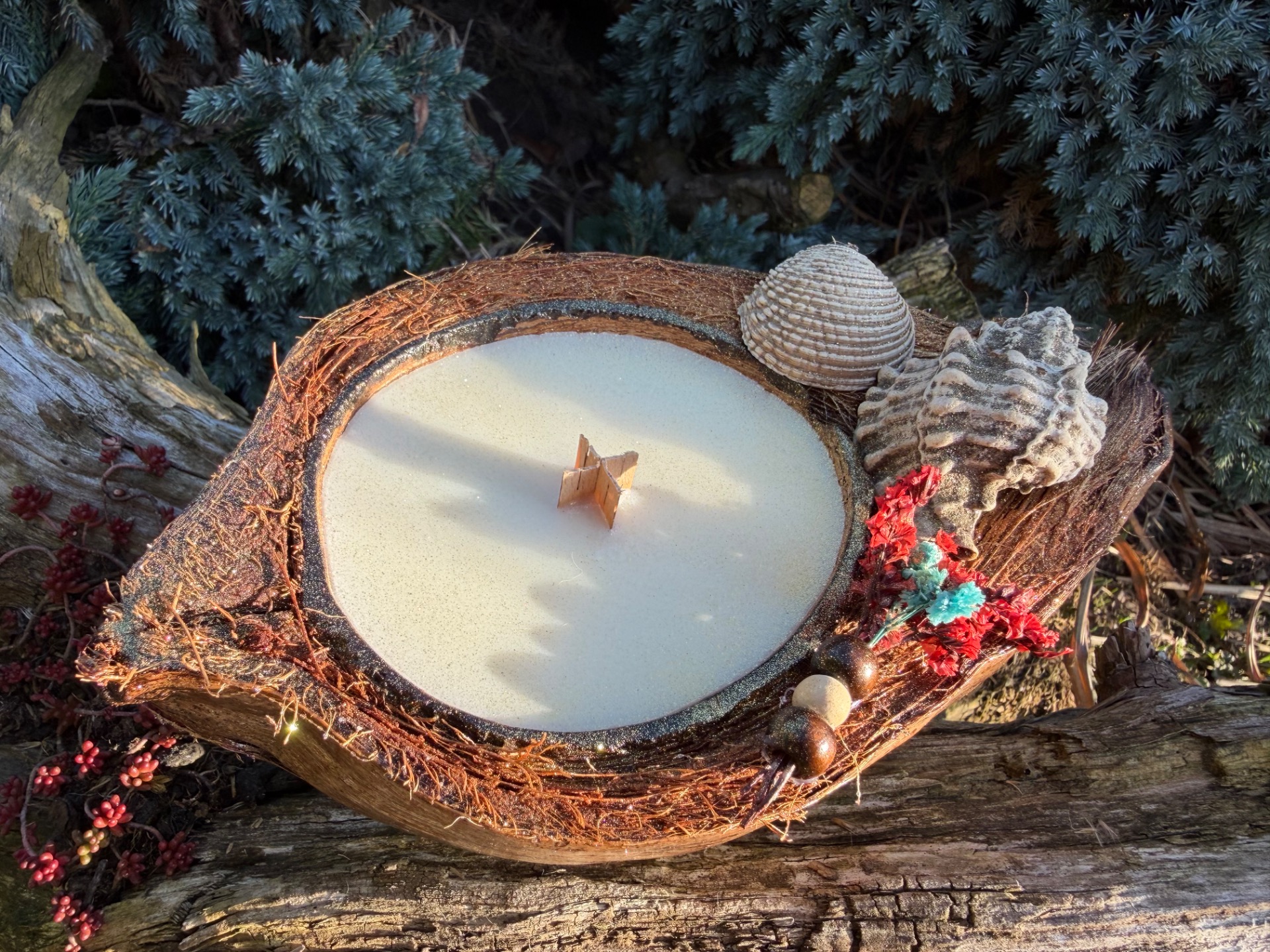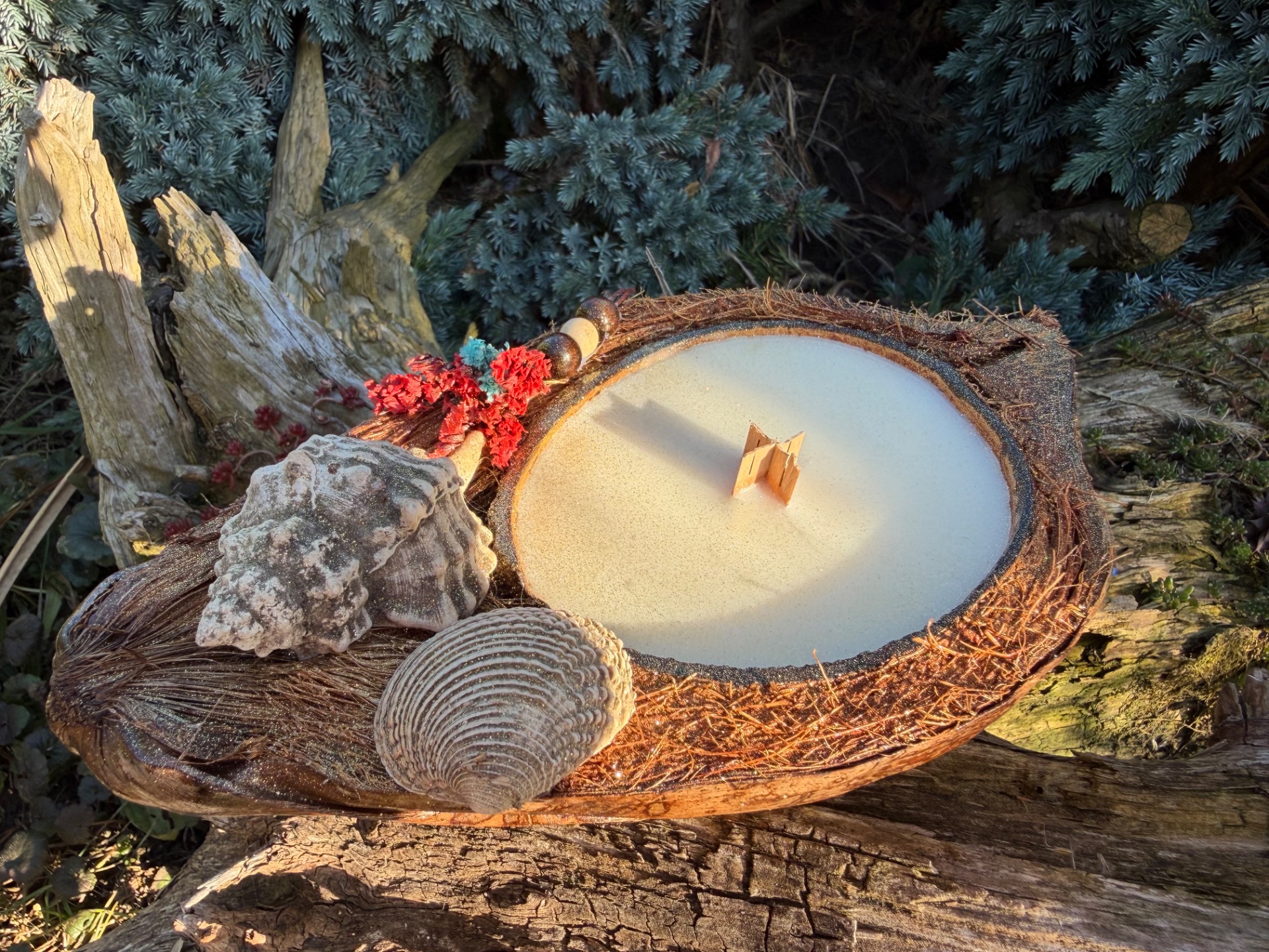 Svíčka v kokosu mušle a květy červená-tyrkys
