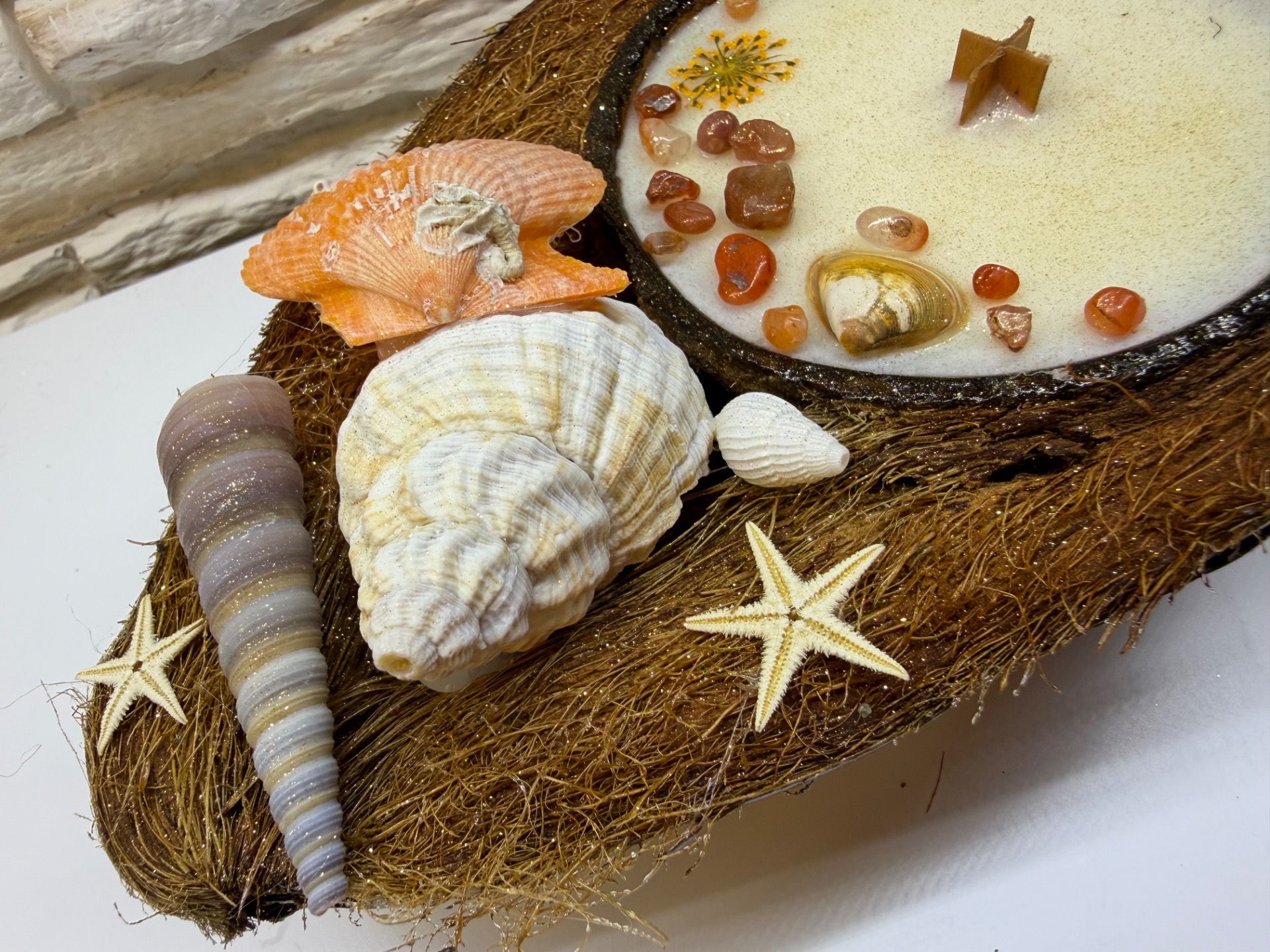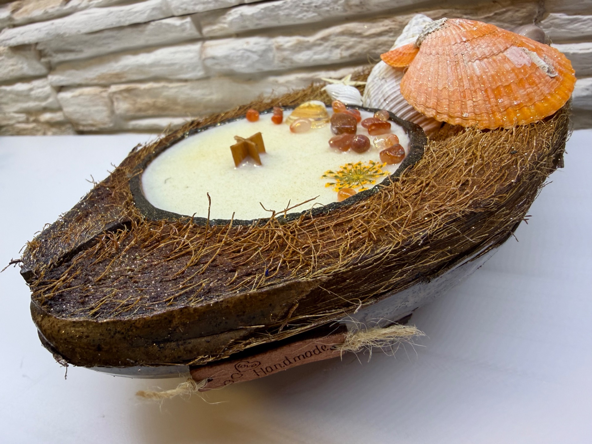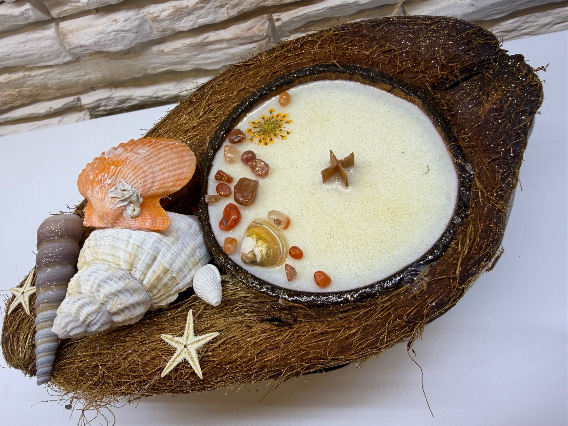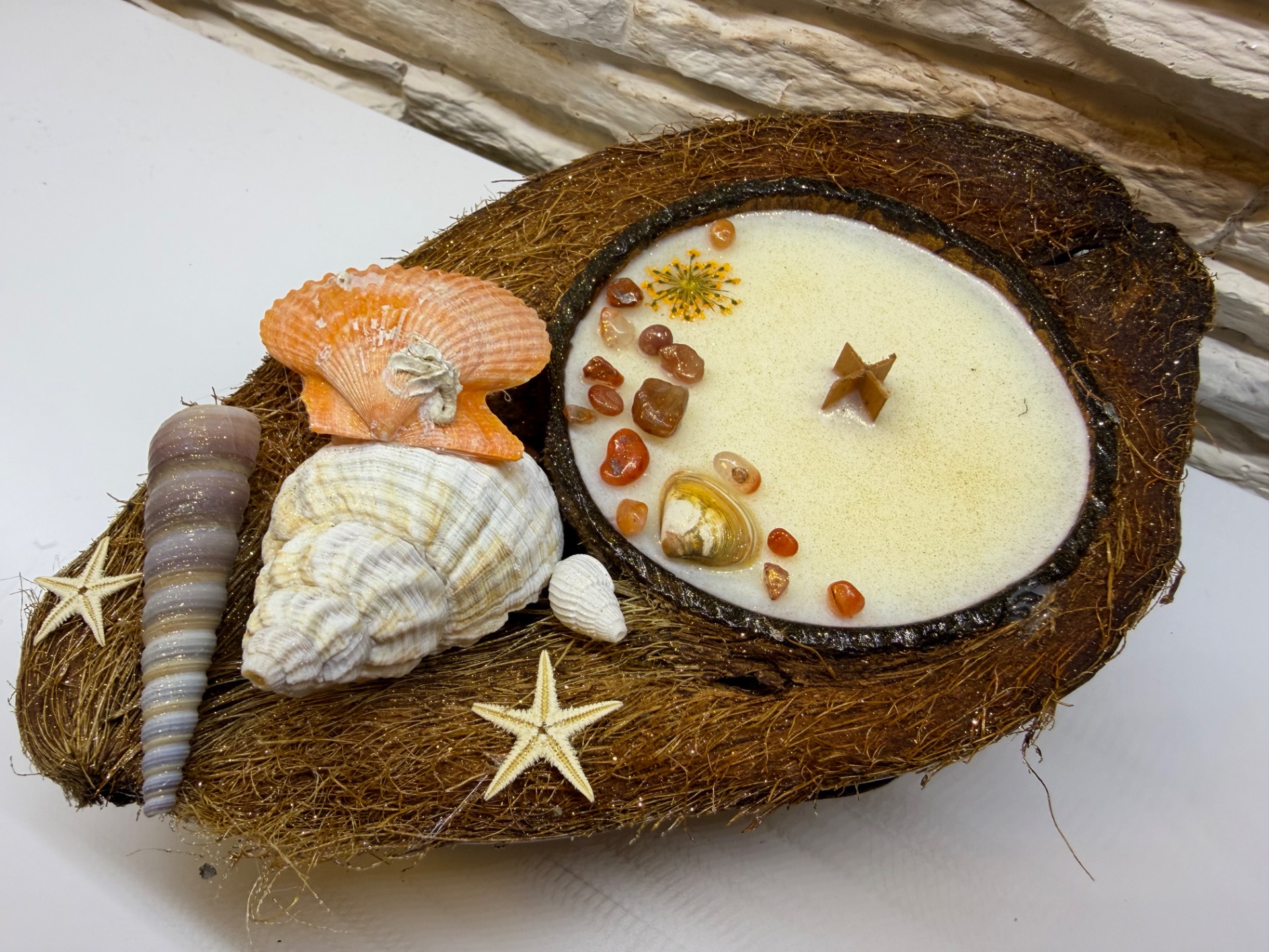 Svíčka v 1/2 kokosu oranžová mušle